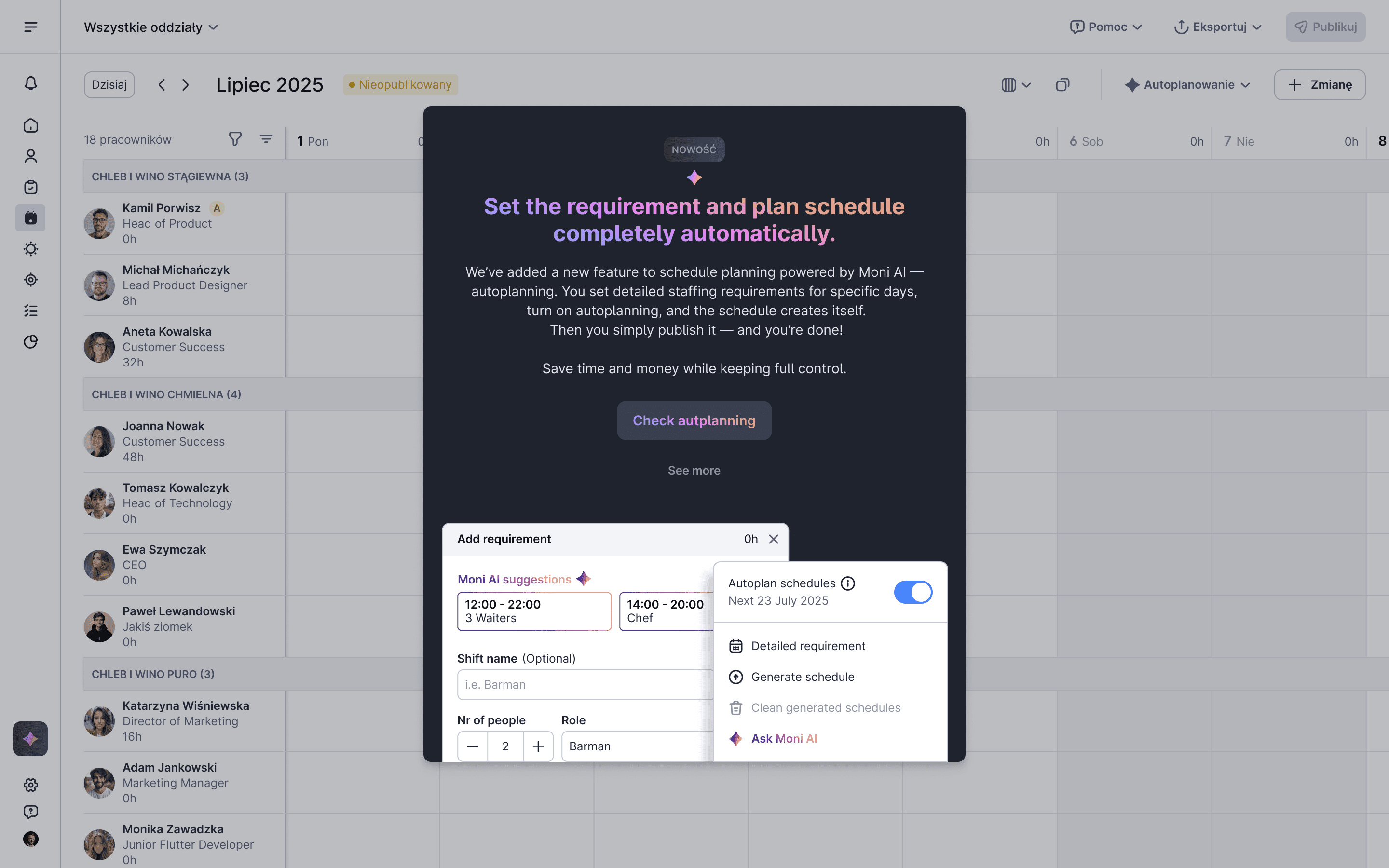 As a part of fullfiling the experience I designed easy to use autoplanning functionality which allows users to set the requirement and plan schedules completely automatically without pointless friction.